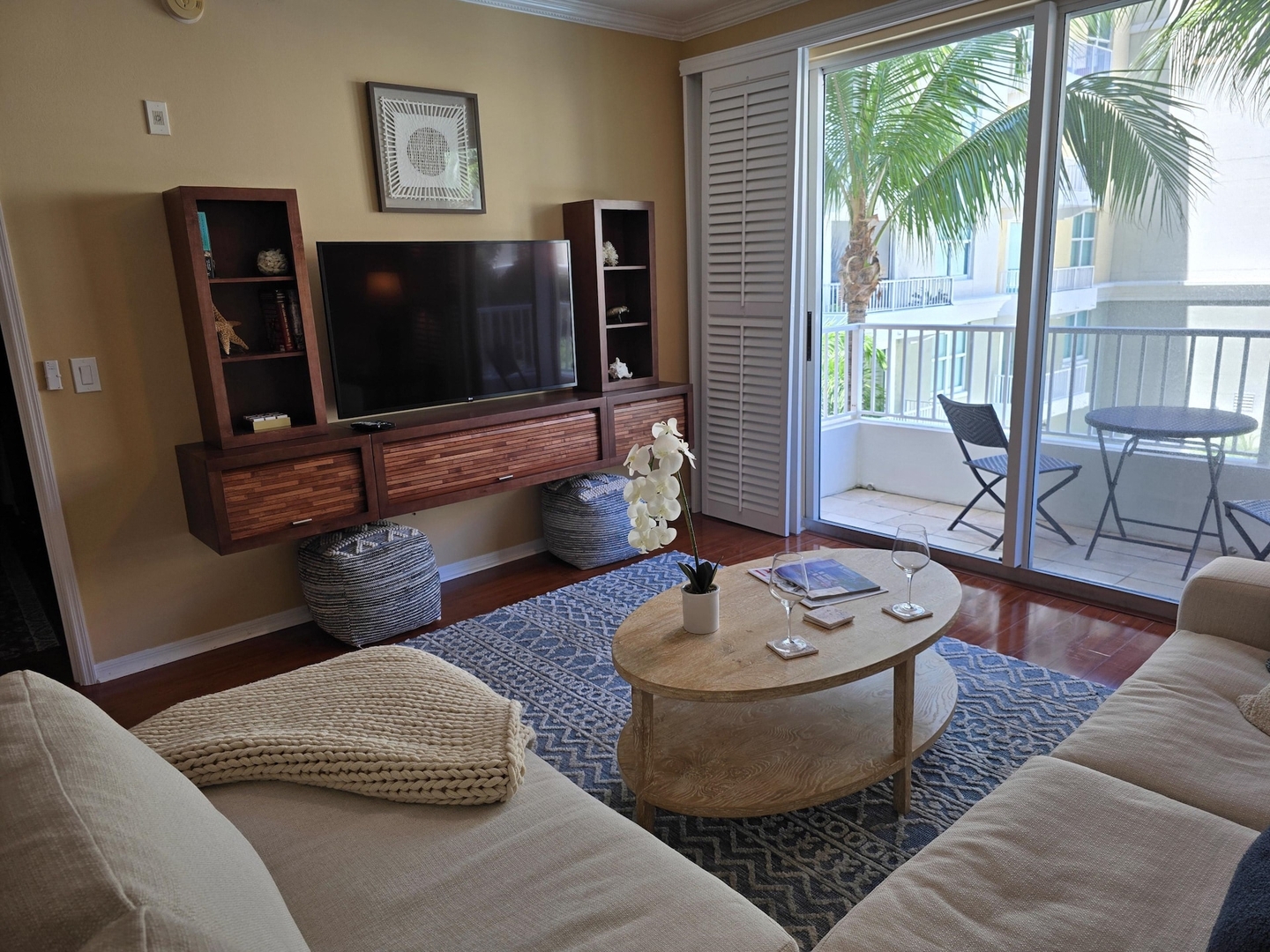 This beautiful two-bedroom unit includes all utilities and all furniture that you see in photos. (Sleeps up to 5). The beautiful and inviting kitchen is fully-stocked with all cook-wear, appliances and cutlery etc and features granite counters, European cabinetry, and a breakfast bar. The living room/dining room space is bright and airy featuring comfortable furnishings, a sofa, and a large screen smart TV (Roku). The balcony is a great place to take your morning coffee or to relax under the stars using the new rattan table and chairs with an inviting view of the inner courtyard, including the pool.