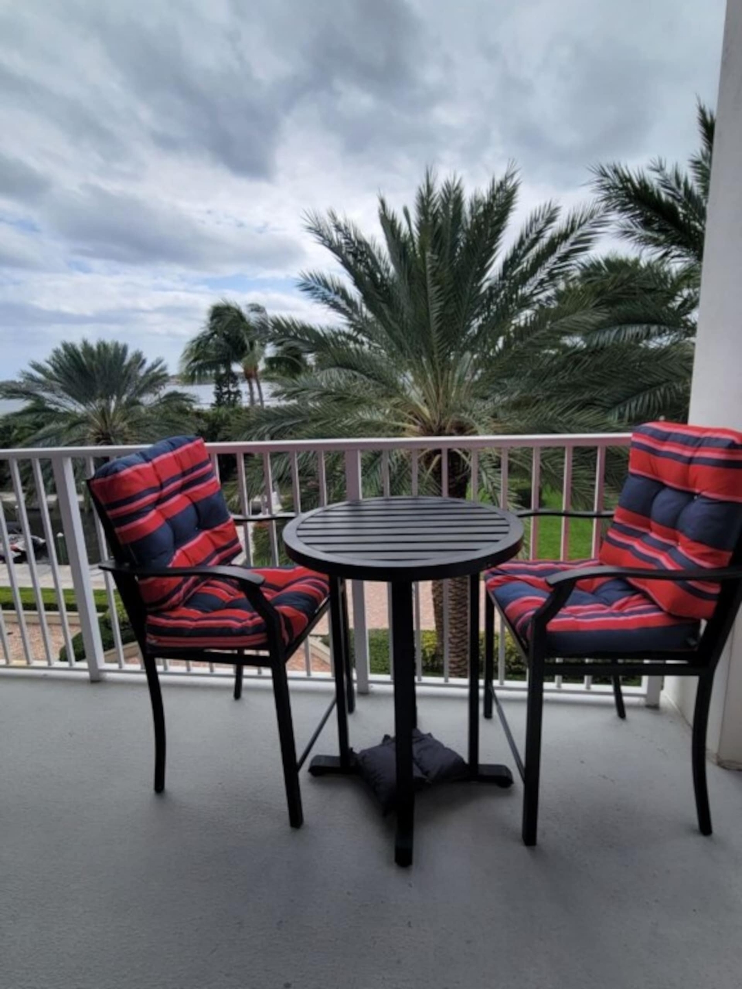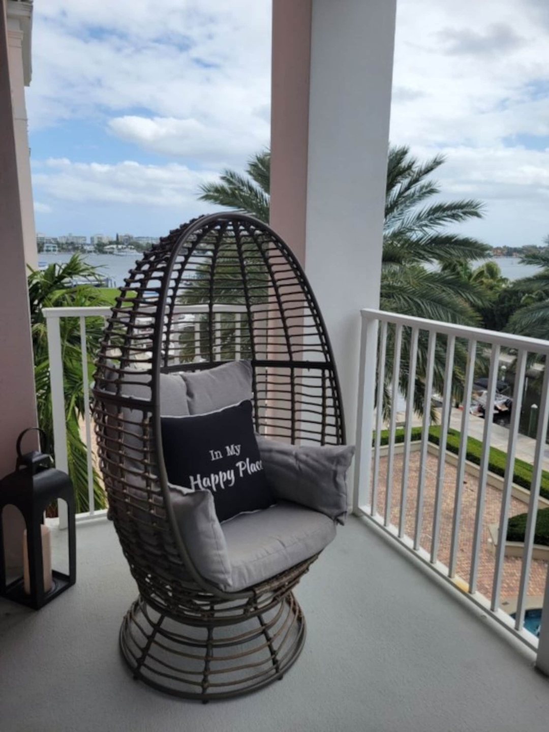 This comfortable sun-drenched two-bedroom unit includes all utilities and all furniture that you see in photos. (Sleeps up to 5). The beautiful and inviting kitchen includes all appliances, cook-wear and cutlery and features granite counters, European cabinetry, and a breakfast bar. The living room/dining room space is bright and airy featuring comfortable furnishings, two sofas, and a large screen smart TV (Roku). The two furnished balconies are a great place to take your morning coffee or to relax under the stars. The new rattan swivel egg is the perfect place to snuggle in and enjoy the spectacular view of the intercoastal, marina and fountain.
