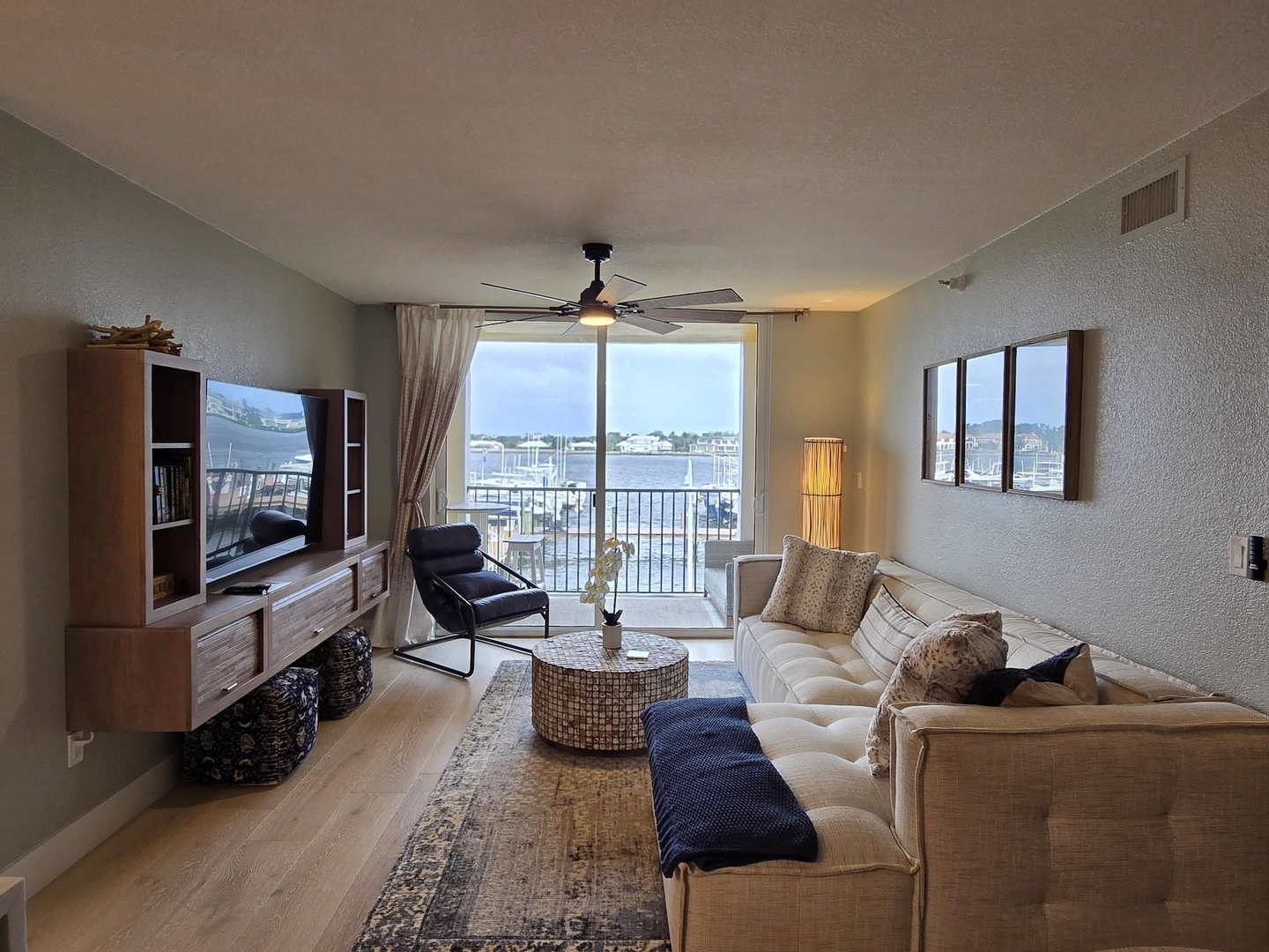 This two-bedroom unit offers a unique experience for the lucky tenant. It truly is a gem not to be missed. (Sleeps up to 4) The kitchen offers modern wood cabinets with a beautiful waterfall quartz countertop and boasts modern conveniences with all the cookware, utensils and necessary items to create meals and indulge. The luminous living room and dining area are furnished for relaxation, featuring a dining table for six, wine fridge, comfortable seating and a large smart TV for entertainment. Step out onto your private balcony as the perfect spot to savor your morning coffee or to gaze at the stars while enjoying the peaceful marina's allure with the intracoastal as a backdrop.