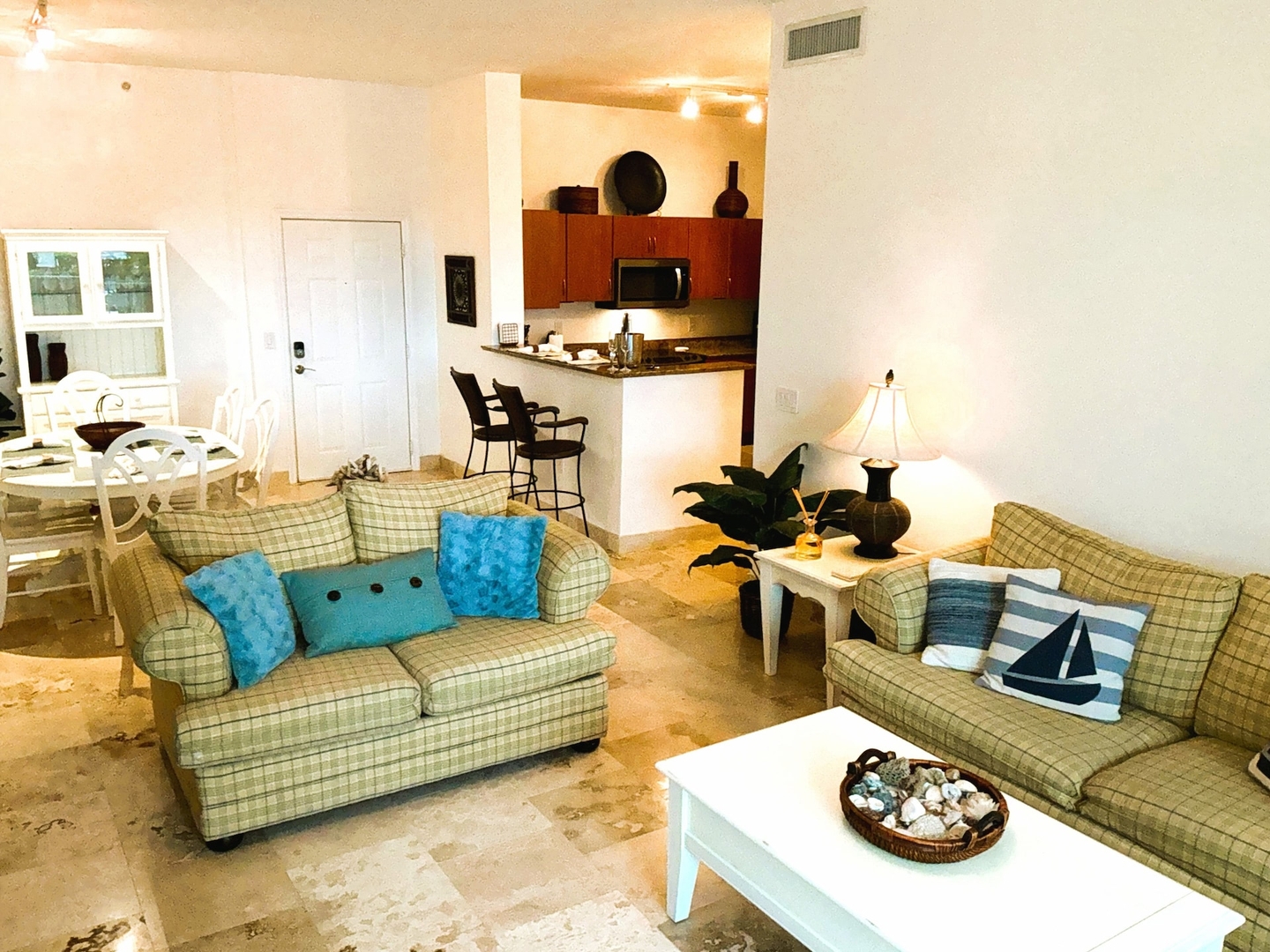 This beautiful, bright two-bedroom unit includes all utilities and all furniture and sleeps up to 4. The open and inviting kitchen is fully-stocked with all cook-wear, appliances and cutlery etc and features granite counters, European cabinetry, and an elevated breakfast bar. The living room/dining room space is bright and airy featuring comfortable furnishings, a sofa, and a large screen smart TV. The spacious dining area provides just the right setting for entertaining family and friends. The balcony is a great place to take your morning coffee or to relax under the stars while luxuriating on your new patio furniture.