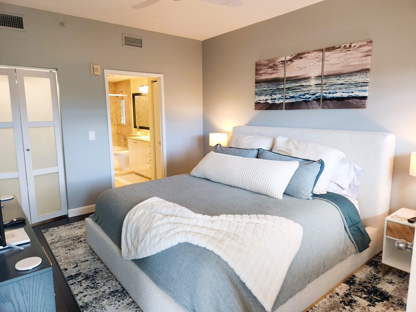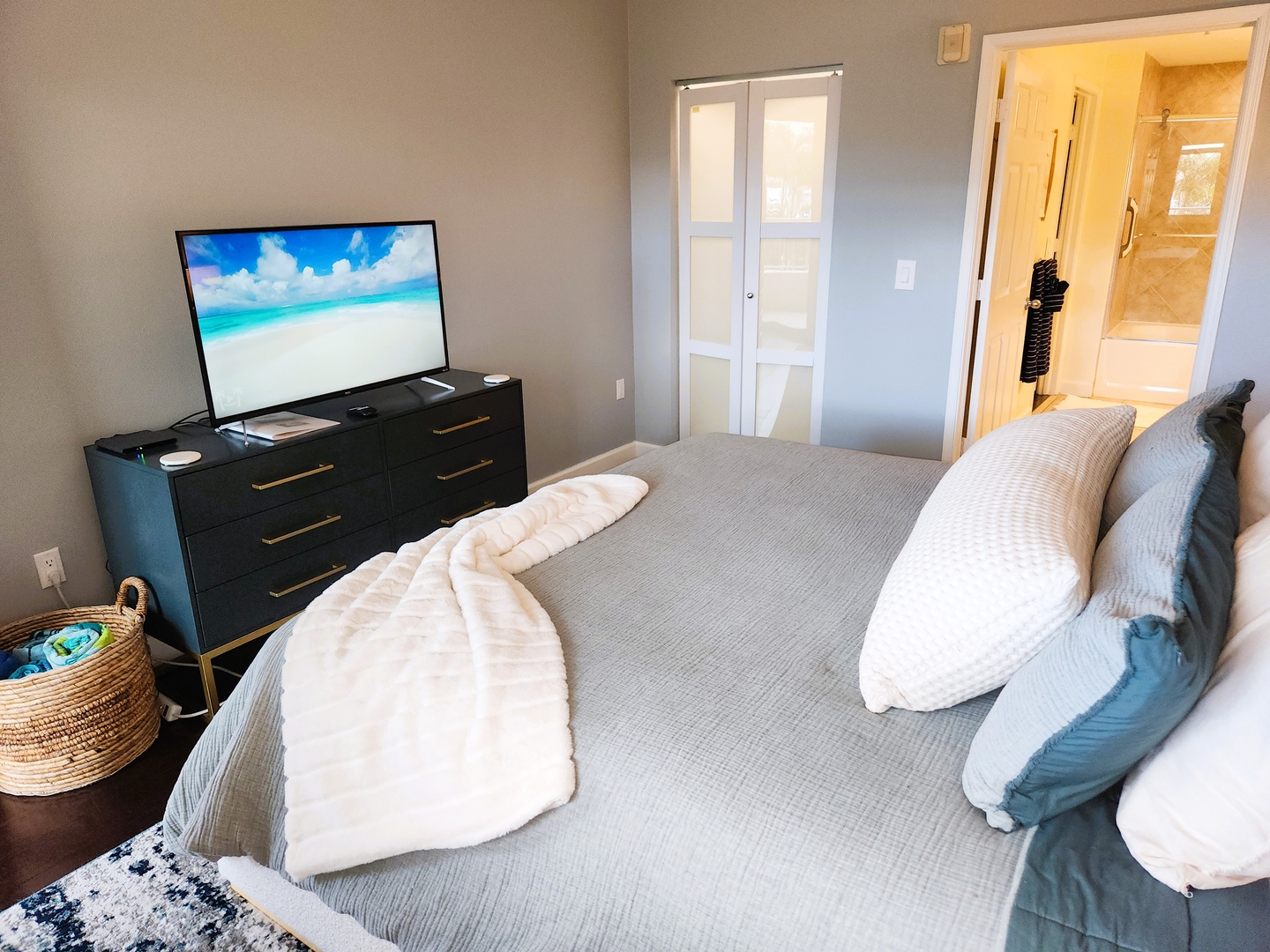 The spacious primary bedroom includes a king-size bed with quality linens, a large dresser, walk-in closet, and a smart TV for added comfort and convenience. The bathroom offers a clean, modern design with a tub and shower combination and an updated vanity.