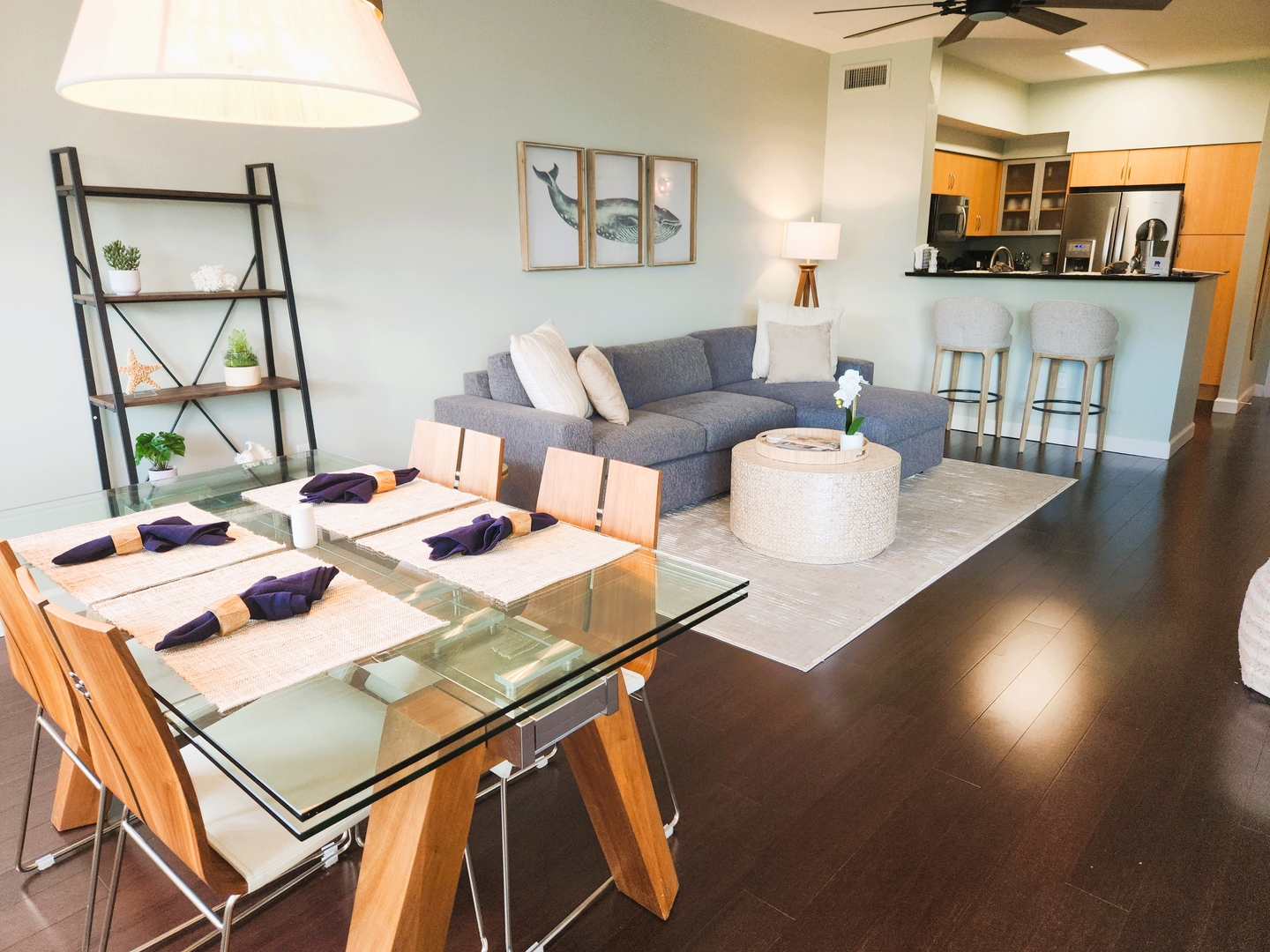The open-concept living area is designed for comfort, with a plush sectional sofa that converts into a queen-size sleeper, making the space ideal for up to four guests. A large smart TV and dedicated dining area create the perfect setting for relaxing or entertaining.